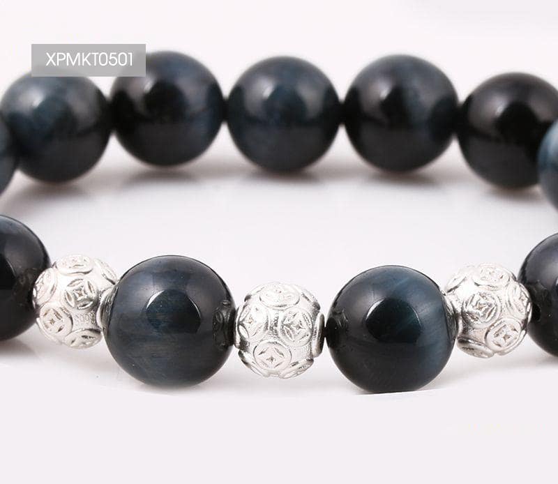 Vòng tay Mắt Hổ Xanh Đen 5A 12 mix Charm Bi Kim Tiền Bạc 925 8 BBKT01