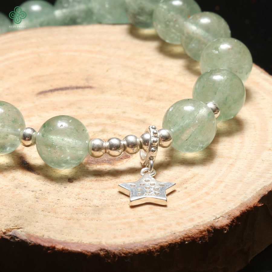 Vòng tay thạch anh dâu tây xanh mix là sản phẩm được thiết kế độc đáo kết hợp những viên đá thạch anh dâu tây xanh với các hạt vòng và mặt vòng bạc xen kẽ.